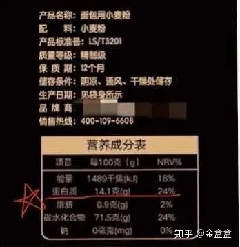 最简单的,就是看面粉包装袋上的营养成分表。看蛋白质一栏,每100g面粉含多少蛋白质即可。