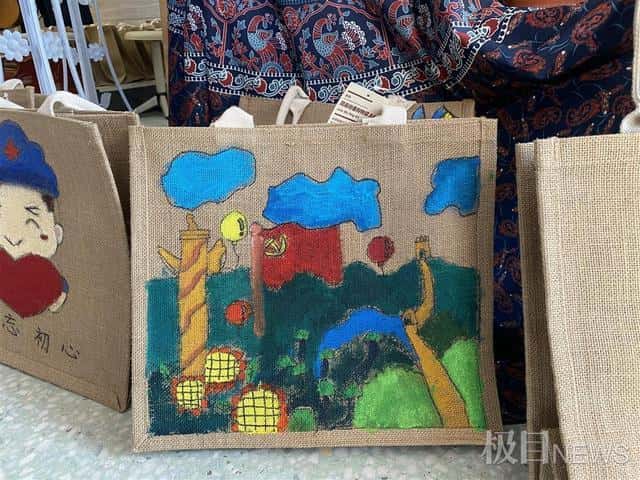 在教学楼楼梯口,极目新闻记者看到,一百三十余个手绘帆布袋陈列在展示台上,每名教师根据自己的喜好进行挑选。“这些帆布袋由学校美术和书法校队的学生手绘而成,还有一部分是学生在课后托管的兴趣班上完成的。”学校美术老师潘瑜介绍,手绘帆布袋的主题为庆祝建党100周年,学生发挥自己的想象力设计草图,再用丙烯颜料在帆布袋上绘制。