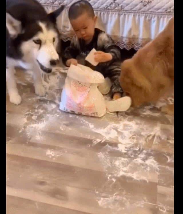 就有这么一位网友,家里养了有两只狗狗,一只金毛犬,还有一只哈士奇。本来这两个家伙就够主人伺候的了,而网友还有个调皮捣蛋的孩子,他们三总是会做一些让主人哭笑不得的事情。这一天网友睡觉醒来,发现儿子把厨房的面粉给拿出来了,而且还解开了袋子,里面的面粉都撒了一地!