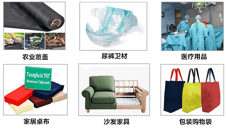 10~40gsm用于医疗卫生用品,如口罩、医用一次性隔离服、头套、鞋套、纸尿裤、成人尿失禁及卫生用品等 ; 17~100gsm(3%紫外线)用于农业覆盖,如作物覆盖地被、根控袋、种子袋、除草垫,苗圃保护套、保温帘、地面防护等; 40~120gsm用于家居用品,如衣柜、储物盒、桌布、防尘罩、墙纸、日历等;50~120gsm用于包装材料,如购物袋、西装套、礼品袋、茶包、大米面粉袋、花材包装等;100~150gsm用于百叶窗、汽车内饰、摄影背景布、广告布等。