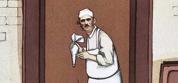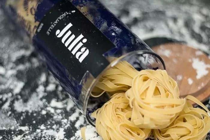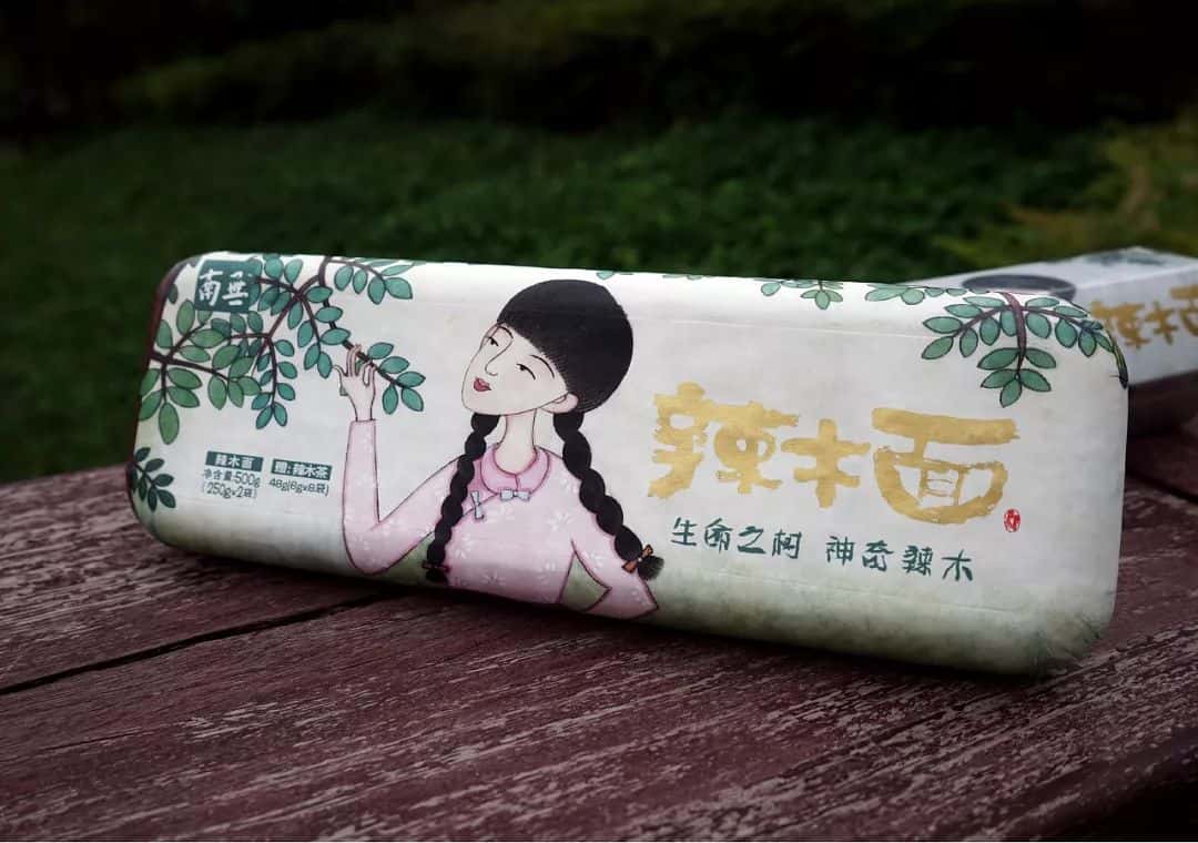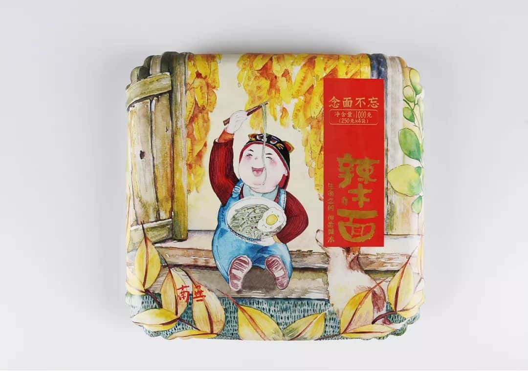 青城干面的包装展示了一幅农耕景象,勤劳的农夫,远处的山城景色,很有地方特色。