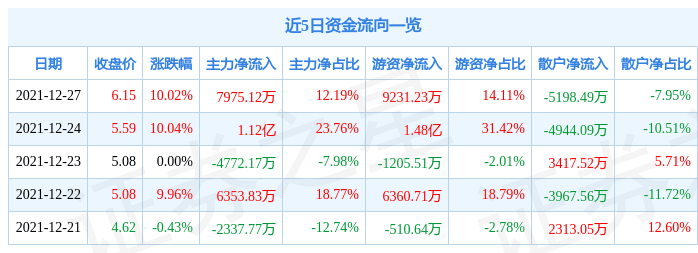 资金流向数据方面,当日主力资金净流入7975.12万元,游资资金净流入9231.23万元,散户资金净流出5198.49万元。近5日资金流向一览见下表: