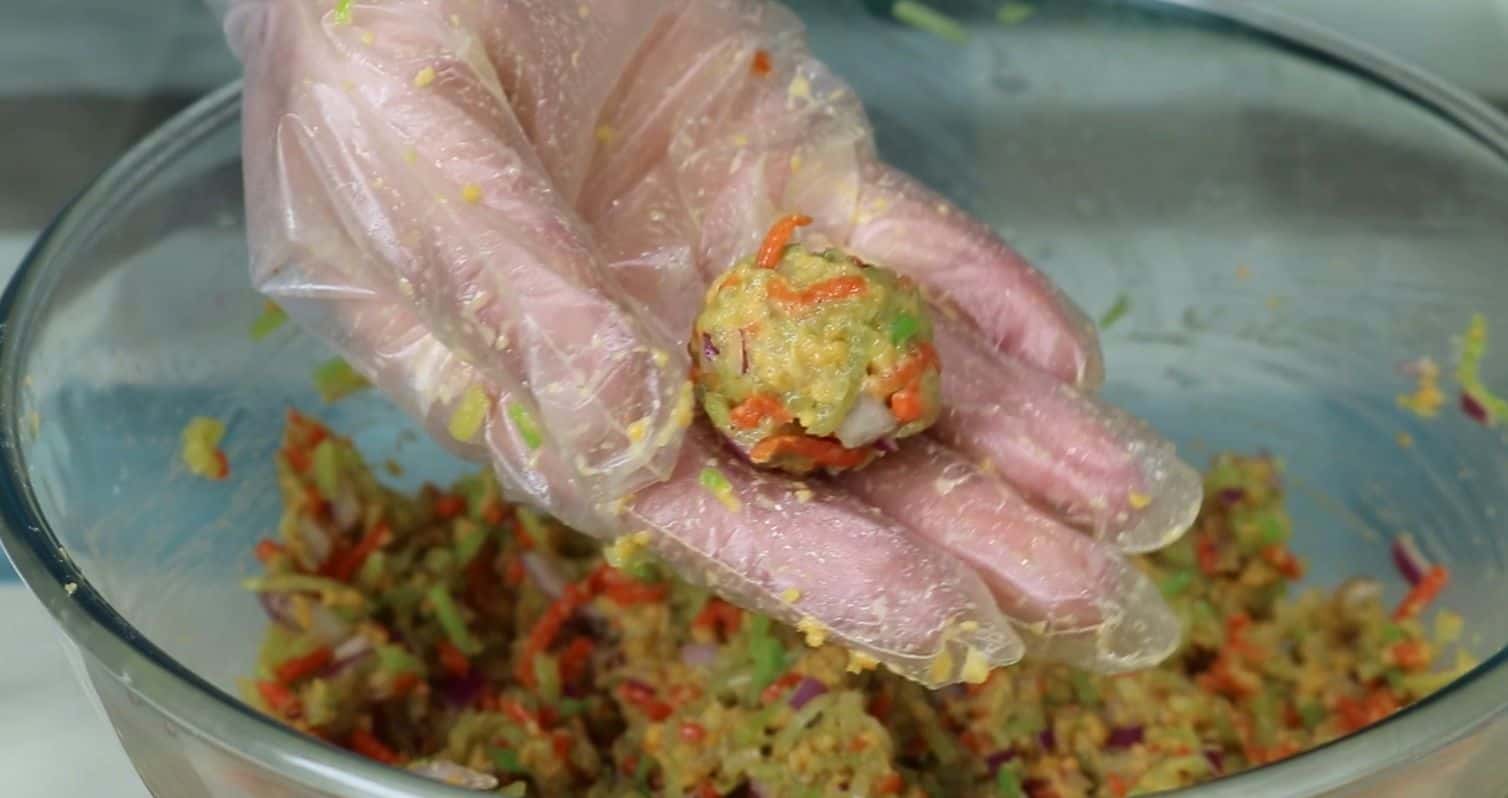 6、将它们抓拌均匀之后咱们再抓上一把馅料放在手中搓成丸子,丸子要稍微小一点,不要太大了,太大了不容易熟。锅先烧热多倒上一点食用油,油温六成热,将丸子放进去,先不要着急着翻动,等炸至定型之后再不时地推动一下,让它受热均匀,炸至金黄酥脆控油捞出,全程大约5分钟,然后就可以吃了。