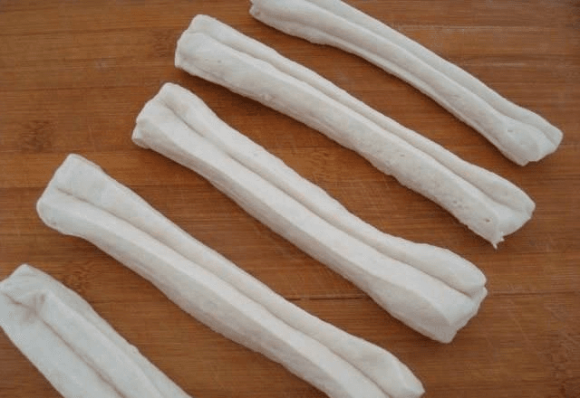 第三步:案板上撒上一层干的面粉,然后把面团取出来,把面团放在案板上,用擀面杖轻轻的把面团擀平一些,厚度要差不多半厘米左右。然后再把擀好的面片准备好,两片面片叠在一起,然后用筷子在中间压一下,就成了油条的最原始形态。锅里加入适量的食用油,油热之后,就把油条放下去炸,炸的时候手和筷子都不要有水分。炸的时候,用筷子适当的翻转一下油条,让油条均匀受热,让它在里面转圈,炸出来的油条才会好看又好吃。