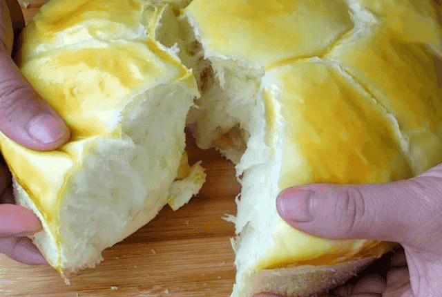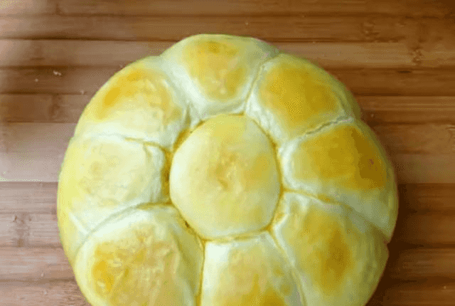 苹果面包第六步:面团发酵好后,在上面均匀的刷上一层蛋黄液,盖上耐高温的保鲜膜,锅中烧开后上锅蒸,中小火蒸45分钟左右,时间到关火后,再焖3分钟就可以出锅了,这样我们的蒸面包就做好了,用刀在模具的边缘划一圈,倒扣脱模即可,非常的松软拉丝,特别好吃。