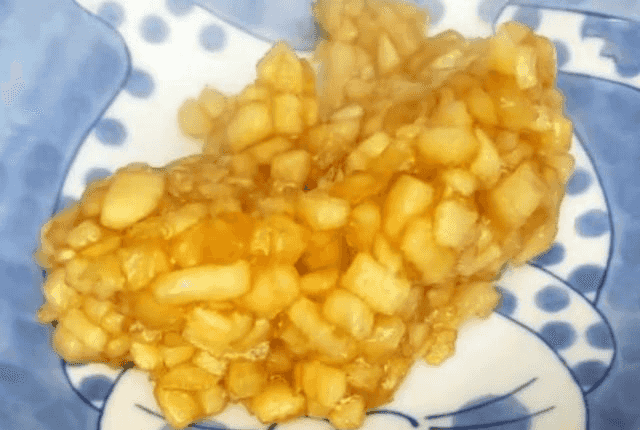 苹果丁第三步:锅中加入50克白糖,清水100克,开小火熬制微微变色,把苹果丁倒进去,翻炒一下,将里面的水汽炒干,然后加入半碗淀粉水,翻炒均匀,就可以出锅了,把它装入盘中,我们的焦糖苹果馅就做好了,放一旁放凉备用。