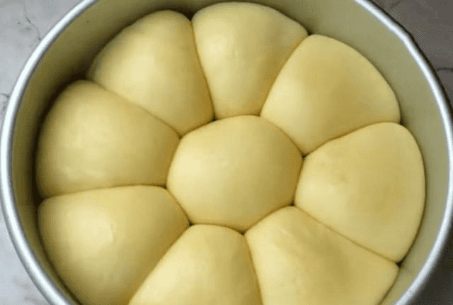 第五步:模具的底部和边缘都刷上一层油,把面包生坯放进来,然后盖上保鲜膜二次发酵1小时,(室温18度左右),再来准备一个鸡蛋,打入碗中,把蛋黄分离出来。备用