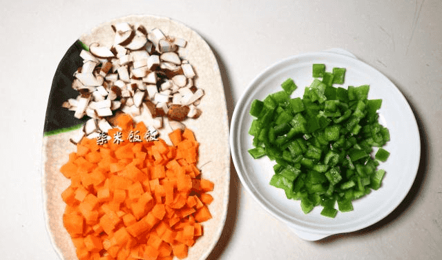 7,提前把胡萝卜、香菇、青椒全部洗净,然后切成丁。这里所用的食材大家也可以根据自己的喜好进行添加或者替换。
