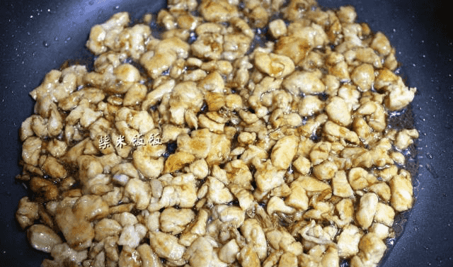 8,热锅凉油,倒入姜丝和蒜末炒香。然后倒入腌好的鸡肉,大火炒至鸡肉变色。