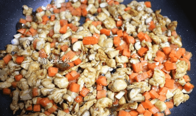 10,倒入香菇和胡萝卜丁,大火快速翻炒均匀。