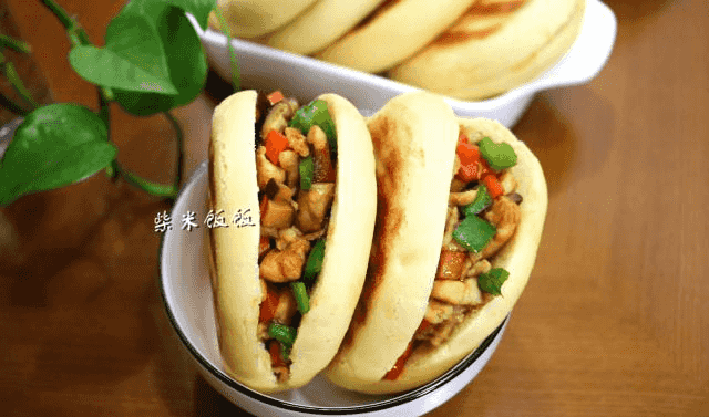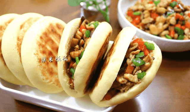 【玉米饼鸡肉夹馍】【食材】面粉150克、玉米面粉150克、酵母3克、白糖、鸡胸肉、胡萝卜、鸡蛋、香菇、青椒、淀粉【调味料】料酒、盐、葱、姜、生抽、蚝油、老抽