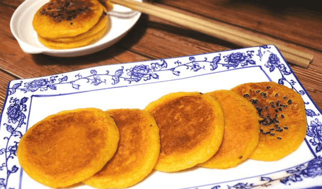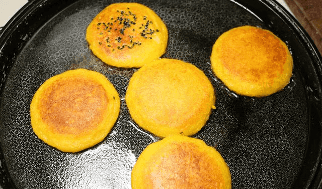 7,电饼铛或平底锅烧热后,倒入少许食用油,把做好的小饼放入锅内。盖上锅盖,一面烙黄翻到另一面。8,烙至两面金黄后就可以出锅了,糯软香甜,特别好吃。