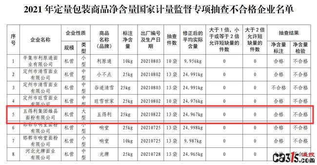 近日,3.15诚搜网从河北省市场监管局发布的冀市监函〔2021〕558号《市场监督总局办公厅关于开展2021年定量包装商品净含量国家计量监督专项检查的通知》(以下简称:通知)中获悉,在面粉净含量抽检中,五得利集团雄县面粉有限公司等8家面粉生产企业标注重量与净含量存在“缺斤短两”,被判定不合格。