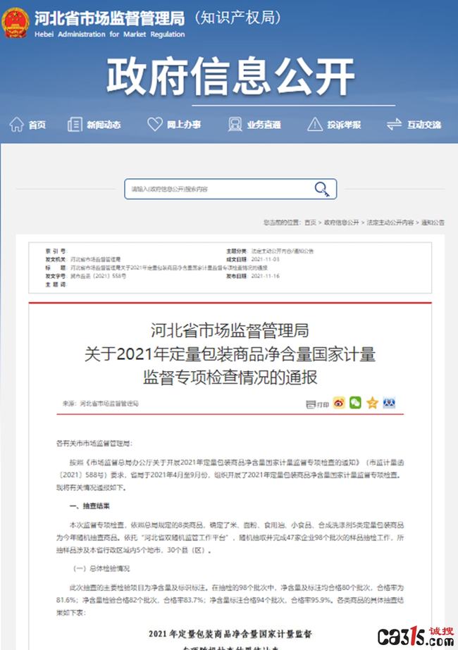3.15诚搜网了解到,在抽检的98个批次中,净含量及标注均合格的为80个批次,合格率为81.6%。净含量检验合格的为82个批次,合格率83.7%。净含量标注合格的为94个批次,合格率95.9%。