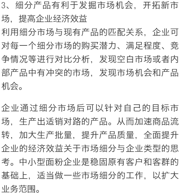 我们面粉为了能够进行有效的竞争,面粉企业就必须进行市场细分,选择最有利可图的市场,集中我们企业的资源,制定有效的产品策略,以取得和增加市场占有率和竞争优势。