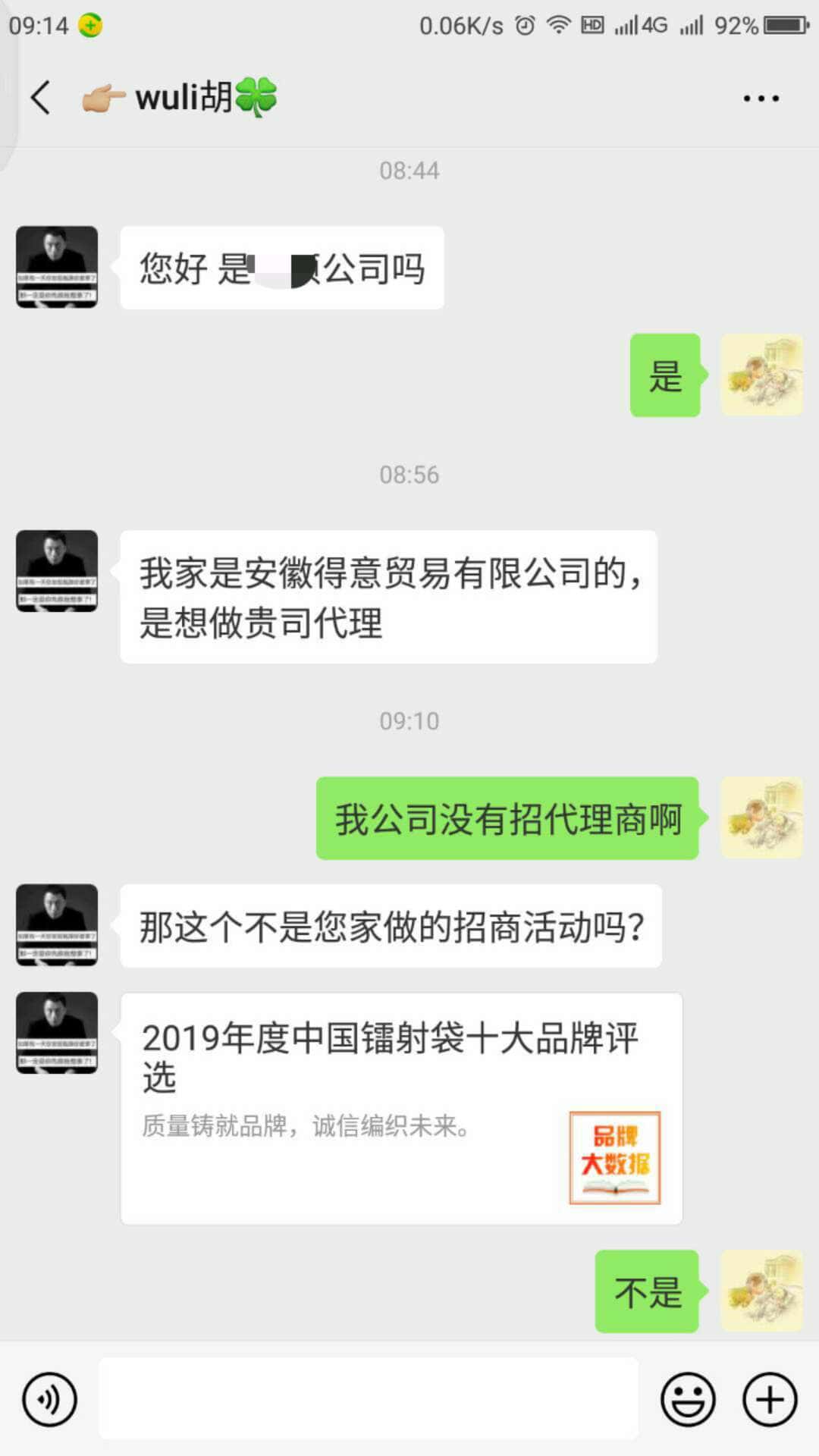 结果今天早上给我发信息,说是想成为我公司的代理,真是莫名其妙,我们是加工企业,并没有像微商传销那样招代理的。