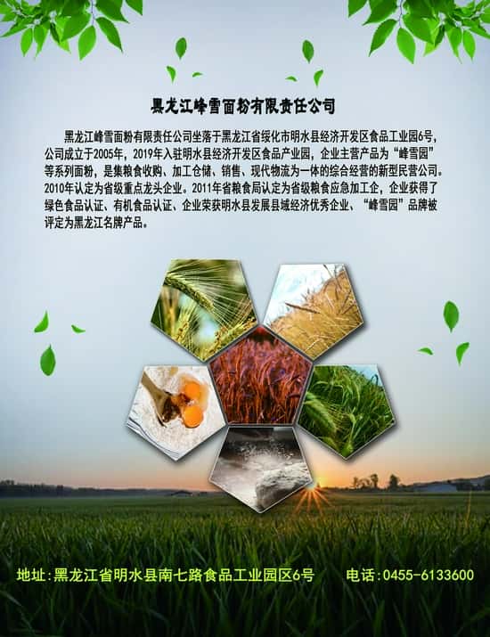 黑龙江峰雪面粉有限责任公司座落于黑龙江省绥化市明水县经济开发区食品工业园6号,成立于2005年,法人代表韩志锋,注册资金600万元。是一家以小麦深加工为主的私营企业,2010年认定为省级重点龙头企业,2011年省粮食局认定为省级粮食应急加工企业。企业主营产品为“峰雪园”等系列面粉,“峰雪园”品牌2011年被黑龙江省名牌战略推进委员会认定为黑龙江省名牌产品,企业拥有国内先进的智能化生产线,年设计小麦加工能力10万吨,2019年实际加工6万吨。公司现有资产3846.8614万元,其中固定资产2678.3421万元,2019年销售收入8500万元,实现利润551.2562万元,上缴税金44.3357万元。企业拥有固定职工29人,解决当地50余剩余劳动力就业,企业获得了绿色食品认证、有机食品认证、企业先后荣获明水县发展县域经济优秀企业、黑龙江省农民创业示范(实习)基地、黑龙江省粮食局颁发的粮食应急加工企业、明水县食品安全诚信企业等。“峰雪园”品牌被评为黑龙江名牌产品。