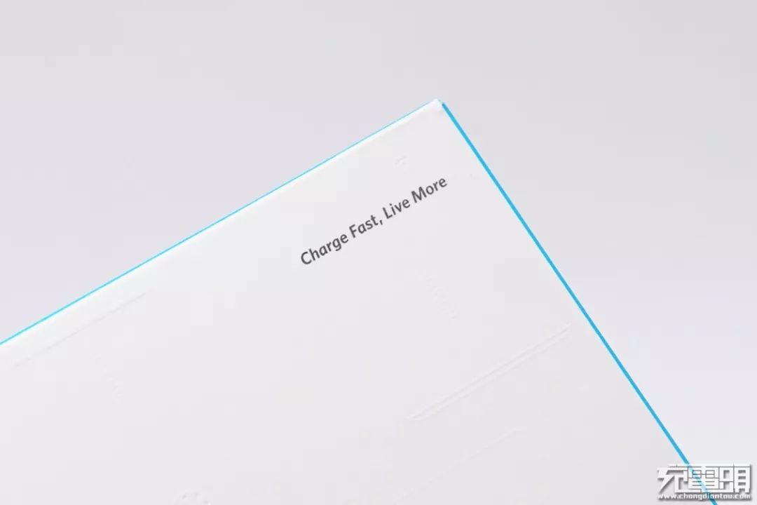 右上角Charge Fast Live More的品牌Slogen,此外包装盒上有很多ANKER产品的压印图案,简洁而不简单。