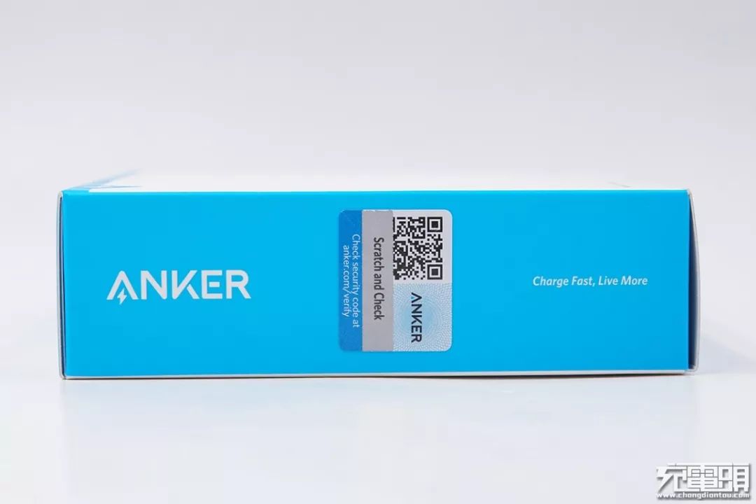 包装侧面有“ANKER”品牌Logo和Charge Fast Live More字样。同时贴有防伪标签,刮开辨别真伪。