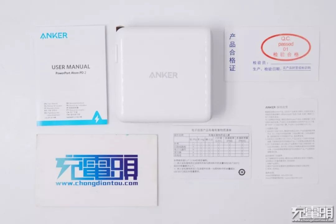包装盒上的详细参数:名称:ANKER PowerPort Atom PD 2 充电器产品型号:A2029重量:178g产品尺寸:68*69*28mm产地:中国颜色:白色保修时间:18个月输入:100-240V~ 1.7A 50-60Hz单口输出:5V/3A、9V/3A、15V/3A、20V/3A双口输出:5V/3A、9V/3A、15V/2A、20V/1.5A