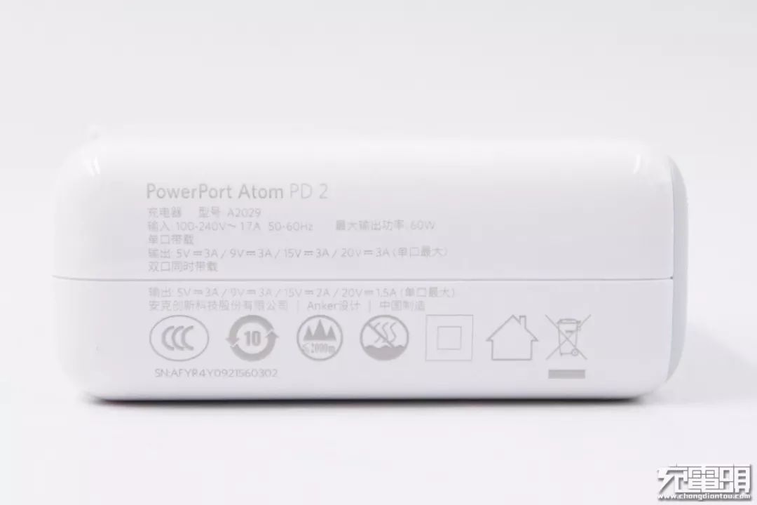 充电器机身上的参数丝印:名称:PowerPort Atom PD 2型号:A2029输入:100-240V~ 1.7A 50-60Hz最大输出功率:60W单口带载:5V/3A、9V/3A、15V/3A、20V/3A(单口最大)双口同时带载:5V/3A、9V/3A、15V/2A、20V/1.5A(单口最大)Anker设计、中国制造