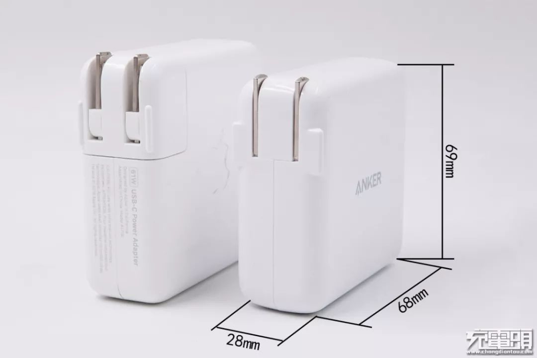 ANKER 60W PD GaN 双口充电器官方声称产品尺寸为:68*69*28mm,在实际比较中比苹果61W PD充电器小15%。毕竟加入了GaN元器件,即便在加入双口的情况下体积控制的也不错。
