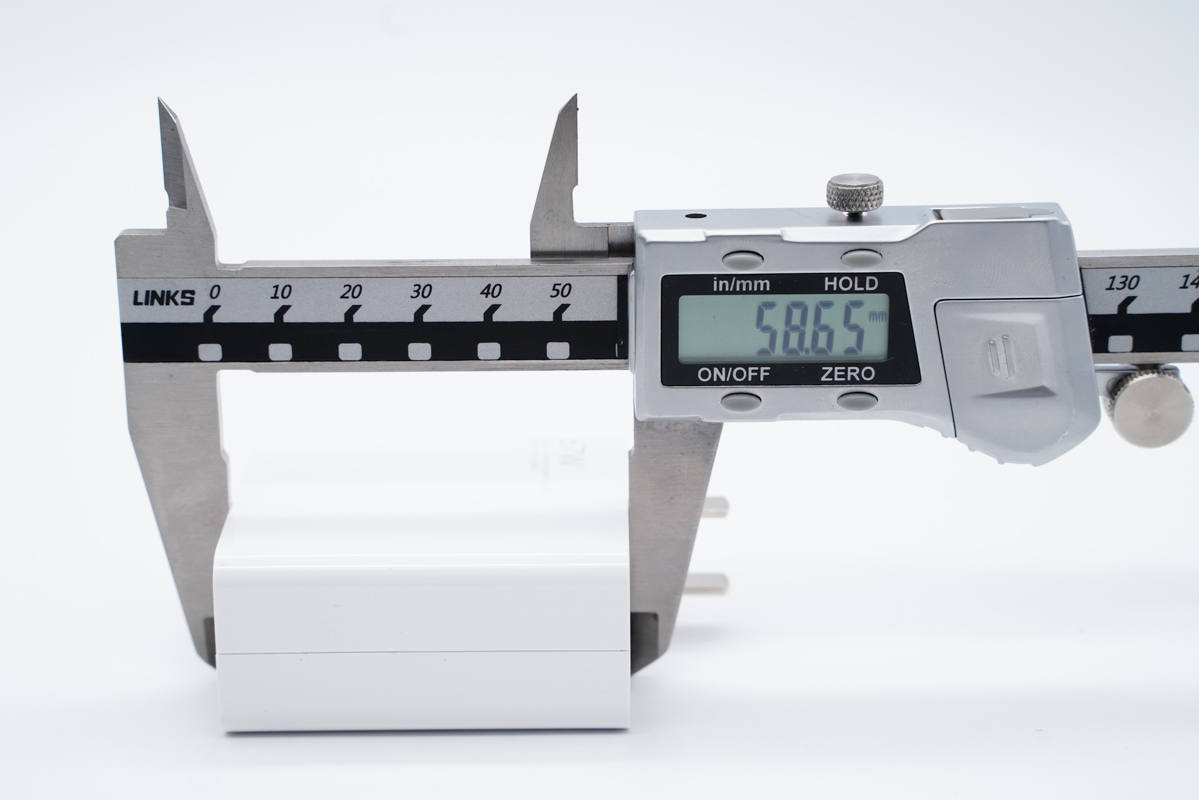 使用游标卡尺实测充电器机身长度为58.65mm。