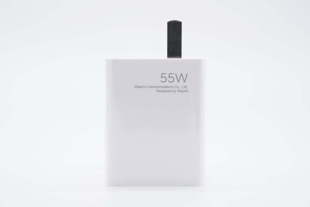 小米11手机标配的是55W魔改氮化镓充电器,采用长方体造型,整机尺寸为52.44mm*42.19mm*28.54mm,腰身亮面,固定式国标插脚,且靠侧边设计。