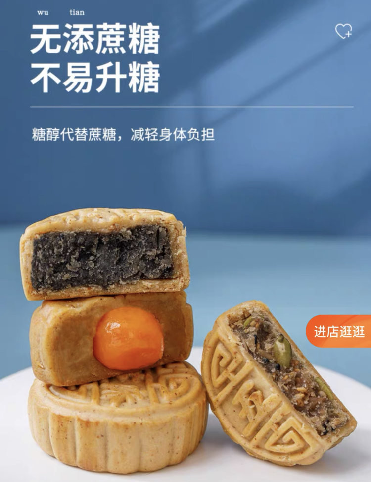 多家销售“无蔗糖月饼”的店铺将“糖尿人群适用”“糖友定制”等相关广告语,放在了商品页面的显眼处,针对的是孕妇、糖尿病人等特殊人群。上游新闻记者梳理了多家店铺相关月饼的配料表后发现,虽然标注了“无蔗糖”,但木糖醇、海藻糖等甜味剂也存在,其他的配料与一般的月饼大致相同。