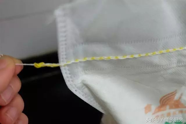 看吧,两根完整的封口线就在手里了,拆面粉袋是不是很简单呢。一定要记住这个小口诀:面粉袋,朝自己,是双线,左边拆。是单线,右边拆,一手一根线,轻轻松松把袋拆。是不是很好记呢!不仅是面粉袋,所有的封口线都是这样的哦。
