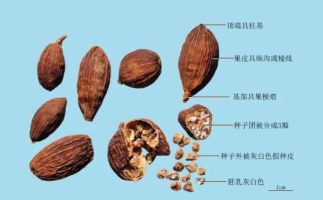 草果的果实呈两头稍尖的椭球形,截面略呈三棱形,而且身上也具有很多凸凹不平的沟槽。草果里面含有几十粒聚在一团、有棱有角小黑石子一般的种子。