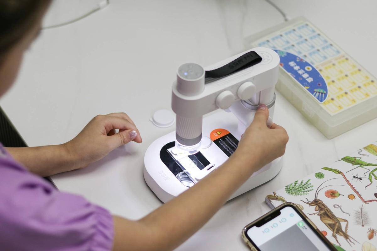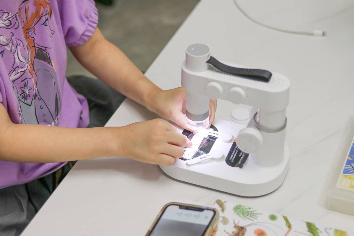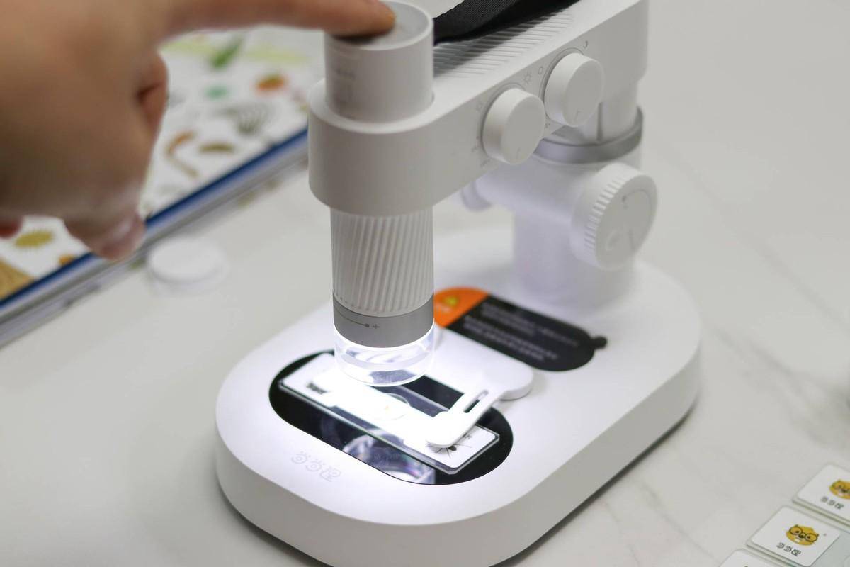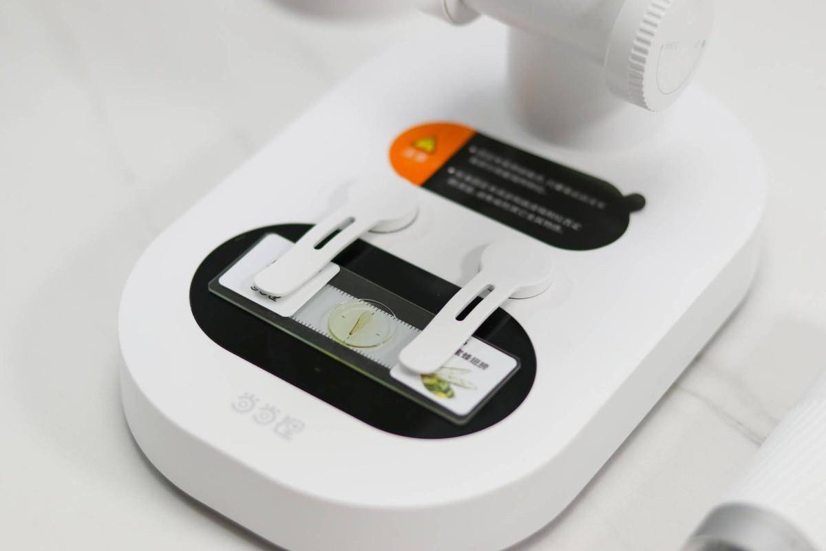 首次使用的时候,我们找出想要观察的标本,放置在观察处,并用标本夹固定好,然后将显微镜单体垂直插入底座安装孔,固定好之后按住电源键3秒开机。