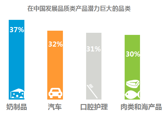 除此之外,奶制品(37%)、汽车(32%)、口腔护理(31%)和肉类及海产品(30%)也是在中国发展品质类产品潜力巨大的品类。