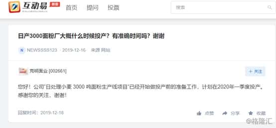 12月18日,克明面业(.SZ)在互动平台表示,公司“日处理小麦3000吨面粉生产线项目”已经开始做投产前的准备工作,计划在2020年一季度投产。