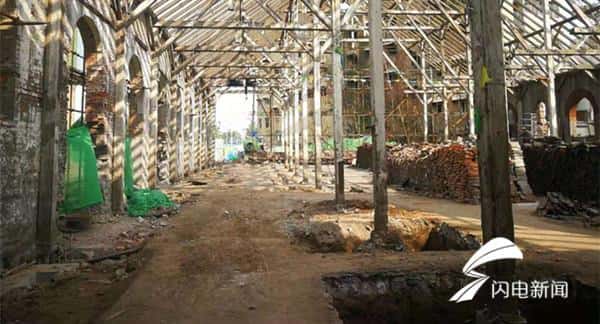 在济南天桥西侧的原成丰面粉厂修缮工程现场,闪电新闻记者看到,原厂区最南侧的办公楼、原粮库、仓库的屋顶瓦片和门窗,全部被拆除,只留下四面墙体和木框架的结构。施工人员在建筑四周搭建起脚手架,加固墙体。