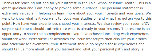 不过,在这里我们也希望可以纠正部分同学的一个误区,即认为个人陈述是简历等文书的简单延伸,是一个详细化的简历。这里,我引用耶鲁公共卫生学院的回答作为参考: