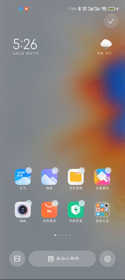在安装好 MIUI 小部件之后,建议先重启手机,然后首先感受到的一个变化就是在桌面空白位置长按,就会发现下方的菜单栏有了很大的变化,除了图标和文字的变化之外,还有“添加工具”被替换成了“添加小部件”,下面还有动图演示。