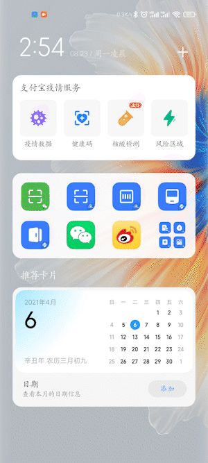 在以上 6 个应用安装完成后,在桌面空白位置长按或者在桌面任意位置双指捏合,即可唤出全新的 MIUI 小部件!