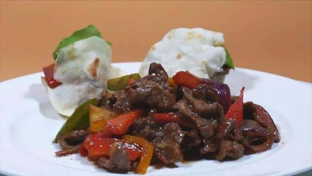 步骤3:锅中少油,牛肉煸炒变色加入葱姜、绿茶水、蚝油、酱油、糖、彩椒、洋葱炒熟即可。