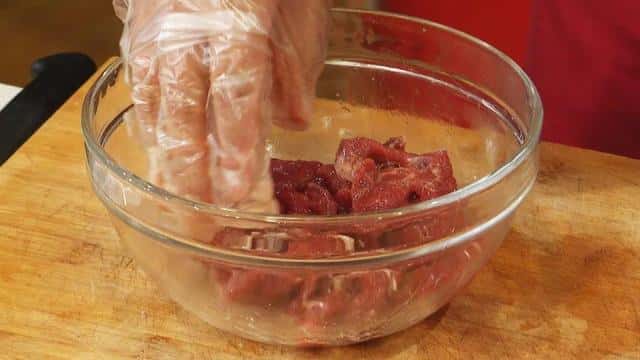 步骤2:牛肉切片,加入蚝油、酱油、葱姜水、盐、蛋清、土豆淀粉上浆抓匀,冷藏腌制5分钟;