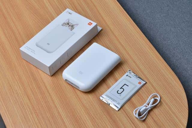 打开小米口袋打印机的包装,其中包括了一台打印机、5张无墨3英寸ZINK相纸以及一支micro USB充电线。