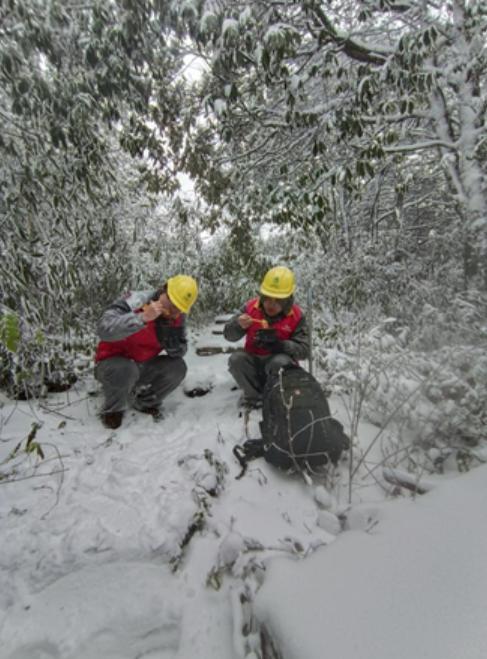 早上6点天色微亮,观冰值守人员胡小波、周耿聪、毛磊就从观冰站整装出发,带上望远镜、探路棍、无人机、风速仪、覆冰称重装置等装备,借着手电的灯光向覆冰观测点出发,争取在天亮气温上升前将现场覆冰情况记录反馈。路上,积雪堆满山间道路,即使套上冰爪,大家也要带好手套依靠双手抓紧周围的树枝才能在铺满结冰、近40坡度的山路上手脚并用、蹒跚前行。