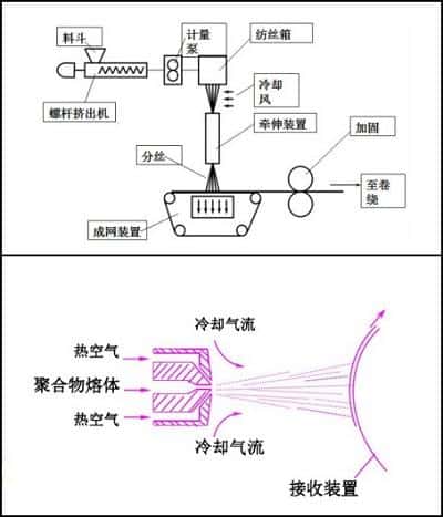纺丝成网和熔喷成网都是利用化学纤维的纺丝方法,在纺丝成型的过程中使纤维直接铺置成网。其中纺丝成网是纺丝溶液或熔体从喷丝头喷出后,经过冷却、拉伸形成一定细度的长丝,在接收装置上形成纤维网。而熔喷成网则利用高速热空气对喷丝头喷出的细流进行极度拉伸而形成超细纤维,然后聚集在接收装置上形成纤维网。熔喷法形成的纤维直径更小,有利于提高过滤效率。