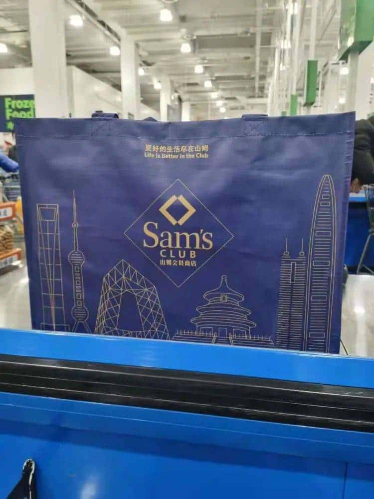 其中,山姆会员商店使用这种蓝色的聚丙烯编织布袋,沃尔玛则用红色的环保布袋替换了原先的塑料袋。据介绍,环保布袋可反复使用,欢迎顾客以后携带这种袋子来门店购物。