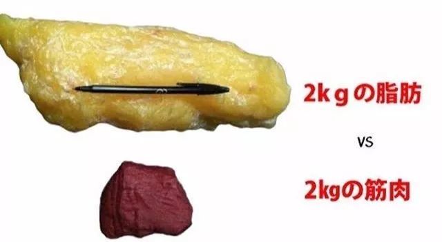 来看看同样重量的肌肉和脂肪,它们的体积却完全不同,脂肪的体积约是肌肉的3倍大。