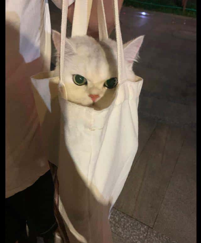 就有这么一位网友,家里养了只猫咪。这一天晚上外面没有太多人了,于是就想着带它出来透透气。因为家里也没有准备太空包什么的,于是就拿了一个白色的帆布袋,将猫咪给装在里面就出来了,大小也正合适,猫咪就露出头看看外面!这也正适合猫咪的性格,不就是喜欢暗中观察吗?