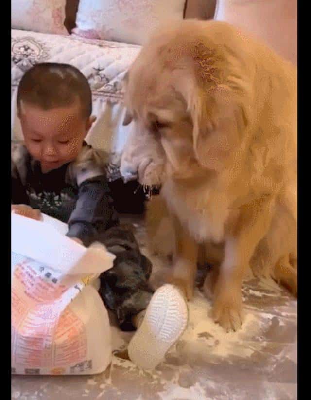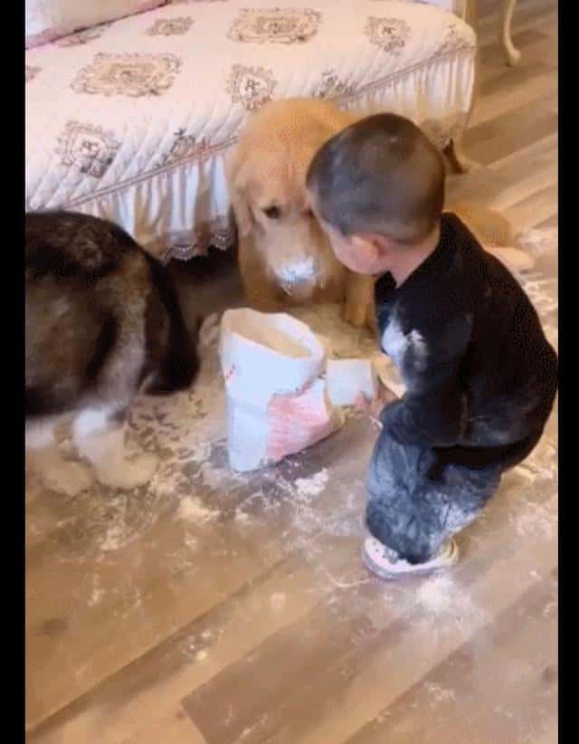 就有这么一位网友,家里养了有两只狗狗,一只金毛犬,还有一只哈士奇。本来这两个家伙就够主人伺候的了,而网友还有个调皮捣蛋的孩子,他们三总是会做一些让主人哭笑不得的事情。这一天网友睡觉醒来,发现儿子把厨房的面粉给拿出来了,而且还解开了袋子,里面的面粉都撒了一地!