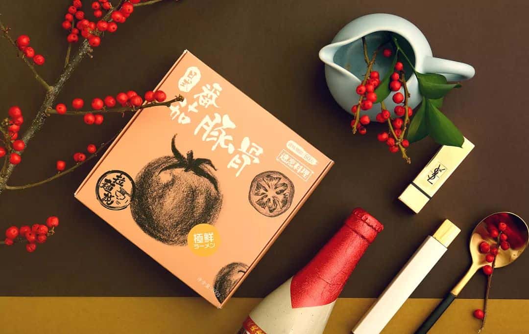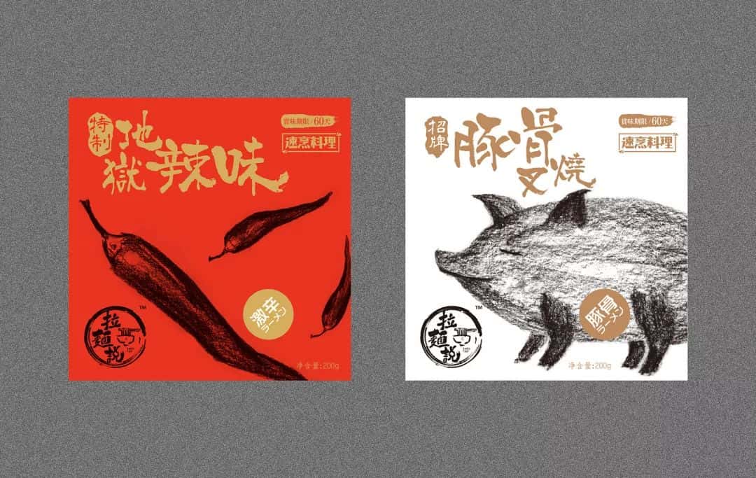 这是一款日式拉面包装,包括面条与调味料的设计。设计上以大面积的单色为底,配上手绘动植物的插画,以不同的种类区分不同的口味。风格简约时尚。