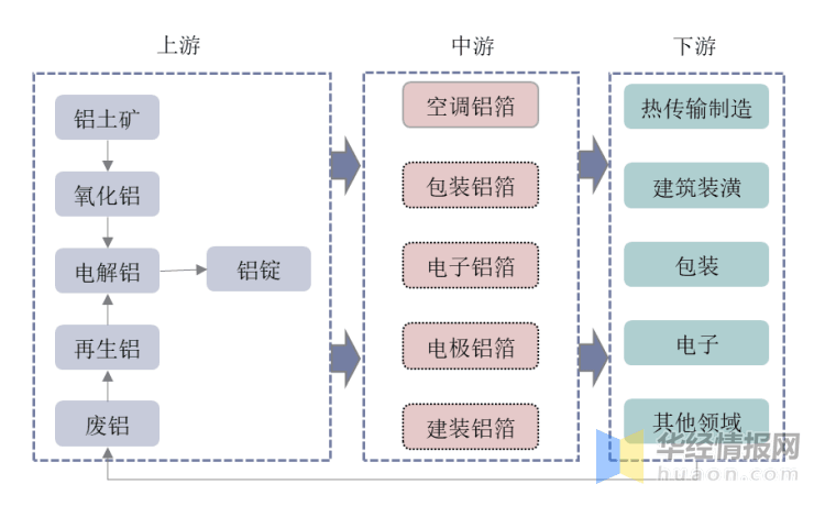 铝箔产业链可以分为上游原材料供应业、中游铝箔制造业、下游各需求行业。铝箔具体工艺流程是:将铝土矿用拜耳法或烧结法转化为氧化铝,然后再以氧化铝为原料,用高温熔盐电解工艺生产原铝的过程。
