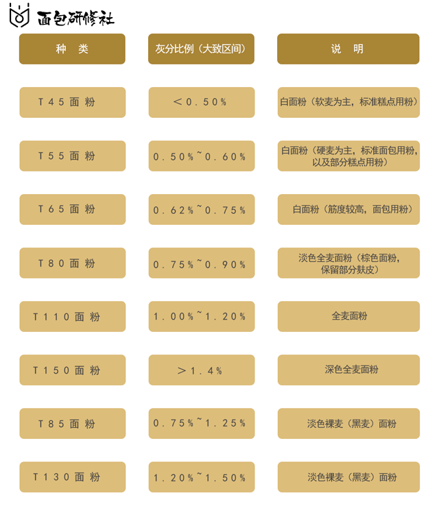 德国粉以“Type+数字”来进行标记和区分,数字的高低代表了矿物质含量的高低。Type812、Type1050、Type1060、Type1150常用于制作面包。其中Type1050与Type1060是全麦面粉,Type1150是黑裸麦粉。